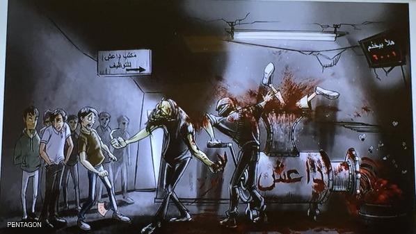 ويصور الرسم الكاريكاتوري شبانا يقفون في طابور أمام "مكتب داعش للتوظيف" وقد بدت أمامهم لافتة ترحب بهم وأمامهم رجل مقنع أظافره طويلة مدماة وهو يلتقط هؤلاء المتطوعين ويرمي بهم في ماكينة لفرم اللحمة كتب عليها "داعش"، في إشارة إلى تنظيم الدولة.