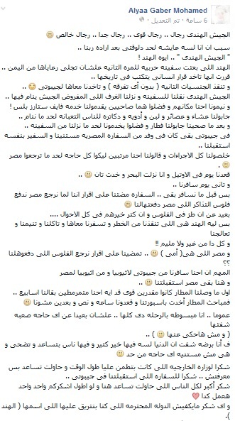 وقالت علياء، عبر صفحتها على موقع «فيس بوك»: «الجيش الهندى رجال، رجال قوي، هما سبب أن أنا لسه عايشه لحد دلوقتى بعد إرادة ربنا، الجيش الهندي نقلنا للسفينة ونزلنا الغرف اللي المفروض الجيش ينام فيها، ونيمونا إحنا مكانهم وفضلوا هما صاحيين يقدموا لنا خدمه فايف ستارز بلس، جابوا لنا عشاء وعصائر ولبن وأدوية وأطباء للناس التعبانة لحد ما ننام».