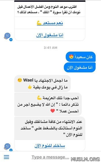 وأضاف التطبيق خدمة جديدة فى إرسال أذكار الصباح والمساء للمشاركين فيه، وحثهم على ترديد هذه الأذكار للتقرب إلى المولى عز وجل فى كل وقت، كما تجده يفاجئك فى منتصف الليل بالسؤال عما إذا انتهى العمل اليوم أم لا، فإن كانت إجابتك أن اليوم انتهى يرسل لك رابط إلكترونى لقراءة سورة الملك، وإن كانت إجابتك بـ"أنا مشغول الآن" يرسل لك رسالة أخرى تنص على: "ما أجمل الاجتهاد مع ذكر اسم صاحب الأكونت على فيسبوك المشارك فى التطبيق، ما زال فى يومك بقية أحب جدا تلك العزيمة، تذكر دائما أن الله لا يضيع أجر من أحسن عملا، عند الانتهاء من كافة مشاغلك أستأذنك بالضغط على جملة سأخلد للنوم الآن ليفاجئك بالسؤال عن سعادة اليوم بالنسبة لك".