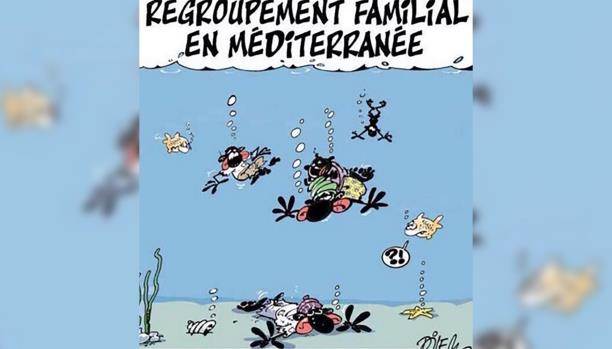 ونشر الرسم الساخر تحت عنوان "تجمُّع عائلي" في البحر المتوسط، ويظهر نظرة الدهشة على وجوه الأسماك في البحر، تصوير الجثث بصورة التهاوي نحو القاع، ثم التصاق الجثث السوداء بهذا القاع.